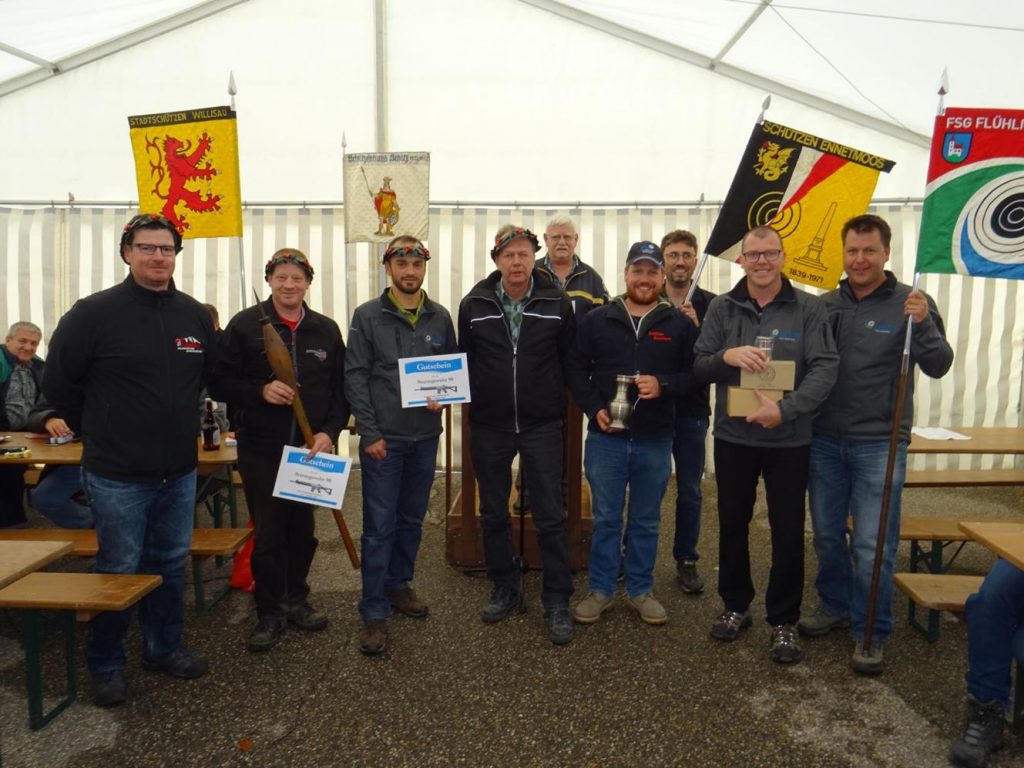 Koni Emmenegger (FSG Flühli-Sörenberg) gewann mit 48 Punkten seinen 2.Kopfkranz. Als zweiter Meisterschütze der Stammsektionen gewann Ludwig Koch (FSG Hasle) mit 47 Punkten seinen 4. Kopfkranz. Nebst dem Tagessieger Toni Felder glänzte auch einmal mehr Urs Röthlin (FS Obernau) als zweiter Meisterschütze der Gastsektionen mit 49 Punkten. Tagessieger Toni Felder und Koni Emmenegger durften als Bundesgabe ein Sturmgewehr 90 entgegennehmen. Bester Junior war Marvin Bieri (FSG Flühli-Sörenberg) mit guten 43 Punkten. Meistersektion und neue Gewinnerin des Divisonär Maurer- Wanderpreises wurde die SG Ennetmoos mit guten 443 Punkten – dies aber nur ein Punkt vor der FSG Flühli-Sörenberg, welche die Zinnbecher entgegennehmen durften. Präsident Bruno Schnider beendetet mit „Bhüet ech Gott und z lieb Heiligchrüz“ den offiziellen Teil. Danach durften die besten Schützen der einzelnen Sektionen die begehrten Wappenscheiben in Empfang nehmen. Theo Hafner (FSG Hasle) war einer der glücklichen Gewinner und besitzt nun alle sechs bisherigen Wappenscheiben. (Heinz Hafner)